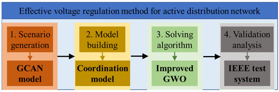 The research method of this article is shown in Figure 1. In detail, this study adopts the progressive technical route of a data-driven collaborative optimization intelligent solution: (1) An improved GCAN that integrates a convolutional feature extraction mechanism to address the randomness of wind and solar power output is designed. A multi-scenario output sample library is constructed through spatiotemporal correlation analysis to provide high-confidence input data for subsequent optimization; (2) Based on the concept of dynamic reactive power resource coordination, an active distribution network regulation model with voltage fluctuation suppression as the core objective is established. By coordinating the reactive power support of inverters, the bidirectional regulation of energy storage power, and the multi-time-scale response capability of on-load voltage regulation equipment, the optimal spatiotemporal matching of reactive power resources in the entire network is achieved; (3) In response to the strong nonconvex and nonlinear characteristics of the model, a hybrid GWO is proposed, which combines chaos initialization and dynamic weight strategy to effectively improve the global optimization efficiency under complex constraint conditions; (4) Through multi-condition simulation experiments of the modified IEEE standard testing system, traditional single-resource control and static compensation strategies are compared, and the comprehensive advantages of the proposed method in voltage qualification rate, dynamic response speed, and economic operation indicators are verified.