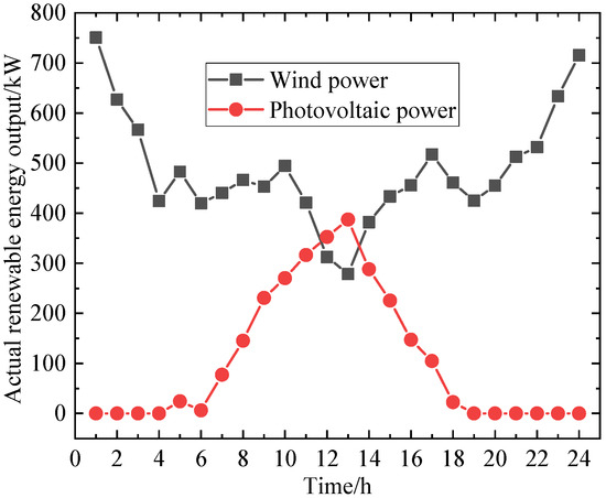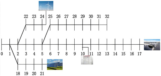 In this paper, an improved IEEE-33 node system is used for case study validation. The topology of the improved IEEE-33 node test system is shown in Figure 3 below. In this system, the wind farm and photovoltaic power plant are connected through nodes 24 and 21, respectively, while the energy storage station and SVC are connected through nodes 17 and 10, respectively. The actual renewable energy output data are shown in Figure 4.