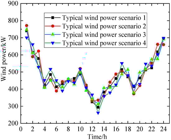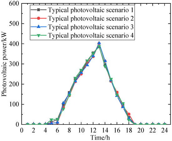 The renewable energy output curves generated and screened using the method proposed in this paper, which constitute typical scenarios, are shown in Figure 5 and Figure 6 below. The number of typical scenarios set in this paper is four.