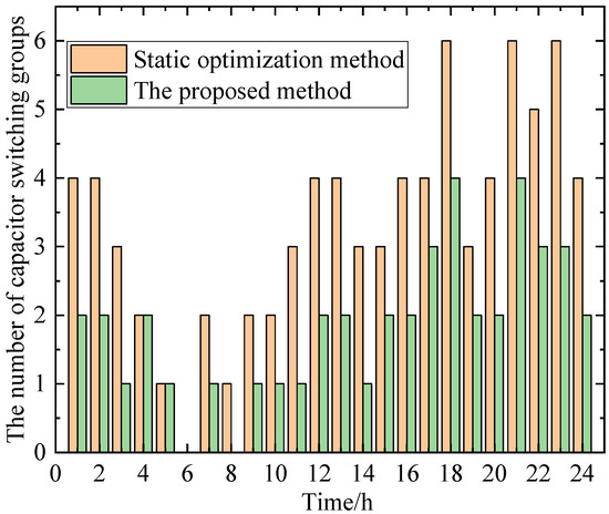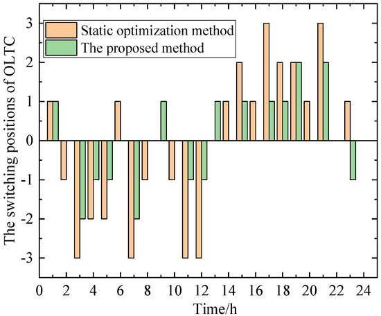 In this paper, a coordinated optimization of static and dynamic reactive power devices is conducted to achieve efficient voltage regulation. When compared with conventional methods that rely solely on static reactive power devices, the switching positions of the OLTC and the number of capacitor banks switched are shown in Figure 7 and Figure 8 below, respectively.