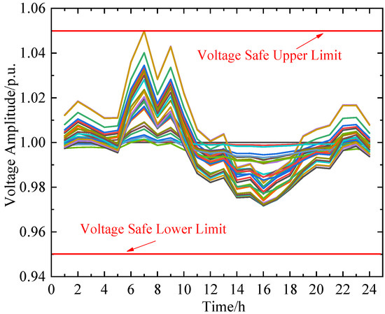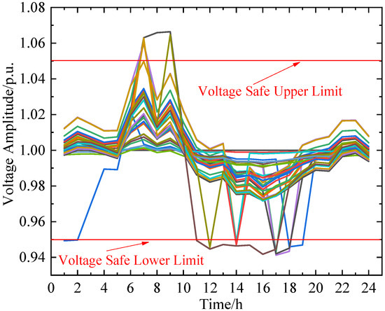 In the distribution network, the standard for optimizing voltage is to ensure the quality of the power supply, the safe operation of the equipment, and economic efficiency. In this paper, the standard for optimizing voltage curves is mainly based on the national standard (GB/T 12325) [33], and the voltage deviation is usually controlled within ±5% to ±10% of the rated voltage. For this article, the voltage was allowed to fluctuate between 0.95 p.u. and 1.05 p.u., but for some extreme scenarios, such as heavy loads or large fluctuations in new energy output, there is no feasible solution for scheduling decisions, and in this case, the hard voltage constraint can only be relaxed. Although a feasible solution can be found at this point, the voltage waveform curve exceeds the safe operating range, as shown in Figure 9. By observing Figure 9 and Figure 10, it can be seen that during periods of high renewable energy output or heavy load, the voltage tends to exceed safe limits. Renewable energy generation, especially from wind and solar sources, is inherently volatile. When renewable energy output is high, if the power grid cannot adjust in a timely manner to balance this fluctuation, it may lead to localized grid voltage increases. In scenarios where renewable energy is integrated into the grid on a large scale, the grid needs to possess stronger dispatch and voltage regulation capabilities. However, if the grid’s dispatch system or voltage regulation equipment (such as OLTC and capacitor banks) lacks sufficient capacity or response speed, it may not effectively address the voltage variations caused by renewable energy output fluctuations. After renewable energy generation is connected to the grid, the fluctuation of its output power will directly affect the stability of the grid voltage. Especially when the proportion of renewable energy generation gradually increases, its impact on grid voltage becomes more significant. When the load increases, the current also increases. Current flowing through line impedance causes a voltage drop, resulting in a decrease in voltage at the load end. This voltage drop phenomenon is more pronounced in cases of long-distance power transmission or high line impedance. If the power source’s capacity is insufficient to meet the demand in heavy load scenarios, its output voltage may decrease. This is because when the power source operates at full or overload capacity, the stability of its output voltage is affected. Reactive power is crucial for maintaining the stability of grid voltage. In heavy load scenarios, if the reactive power supply is insufficient, it may lead to a decrease in grid voltage. This is usually due to the insufficient capacity or response speed of reactive power compensation equipment. The structure and layout of the grid also affect voltage stability. In heavy load scenarios, an unreasonable grid structure or improper layout may result in excessively low voltage in localized grids.