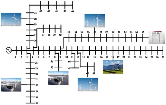 The topology of the modified IEEE-69 node test system.
