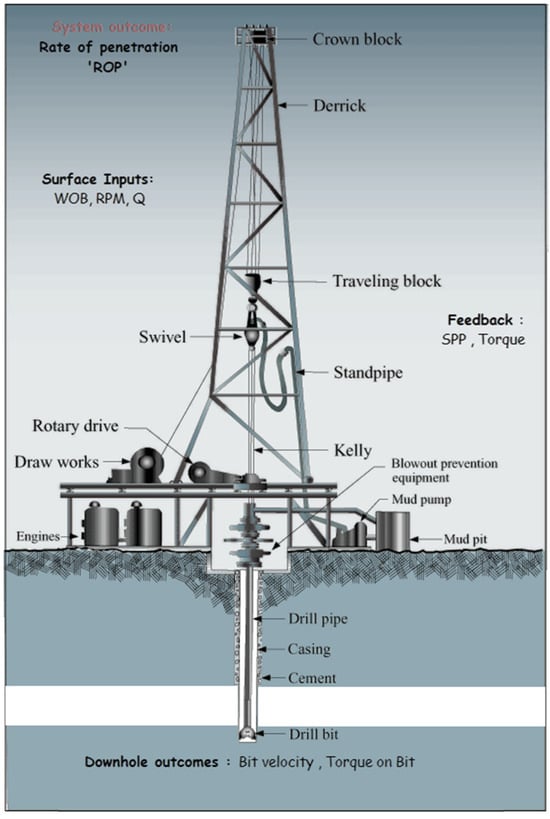 Well drilling is the activity of connecting the bottom reservoir with the surface using a drilling rig and auxiliary pieces of equipment. The top drive is used to rotate the cutting device and the drill string from the surface. Mud pumps inject high-pressure drilling fluid through the hollowed drill string to the bottom to lubricate the bit, maintain the wellbore, and carry cutting to the surface through the annulus. The drill string is a set of drill pipes and the bottom hole assembly (BHA) screwed together by tool joints. The BHA consists of drill collars for applying the effective parameter (WOB) by compression, the heavyweight drill pipe for geometry transition, bottom measuring tools, stabilizers, and a PDC (Figure 1).