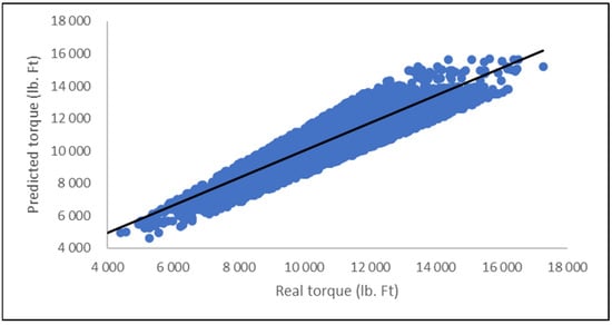 The torque model is used to find new torque after the optimal parameters are found, which will be used to find the new ROP (after optimization). Figure 4 represents the cross plot for the validation of the torque model; the limitation has appeared, and a slight deviation from the unit line is observed as the modeling strategy used the minimum drilling parameters to have operational impact and high computational efficiency. Also, the torque model outcomes will confirm only the reduction in the torque fluctuation. The R square (0.9) show an acceptable value to use the model as cited in Table 1.