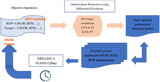 The execution time of this cycle depends on the computational resources. It was less than a minute to complete this process (modeling and optimization) on a 16 GB RAM laptop computer with an Intel 7th Generation i7-7500U CPU @ 2.70 GHz. With this computational capacity, the ROP model can be retrained and optimized to select the best operational parameters every minute, but changing the drilling parameters often would be unrealistic in practice. For this, the frequency of the model update is set at the time required to drill a stand. However, the ROP model can be retrained at any time, even before drilling the entire interval. If the driller finds that the vibrations are too high or the torque increases sharply, it is necessary to modify these parameters.
