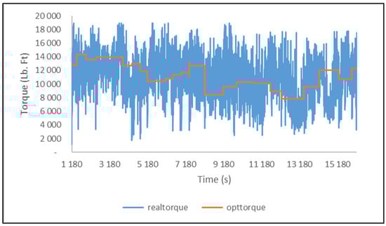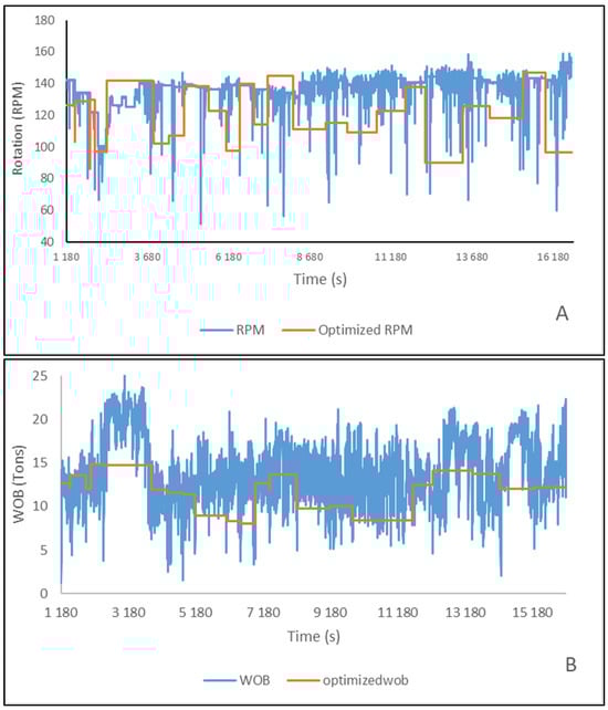 The artificial neural network model provides the optimal drilling parameters after the training during the first stand drill. Figure 6 presents the optimal RPM and WOB while applying the torque condition for avoiding harmful drilling vibrations. As shown in Figure 6, the system provides stable parameters, and the optimal WOB/RPM determined by or dependent on the collection or analysis of data is different from the real WOB/RPM selected in the drilling program. Specifically, the ANN recommends roughly a 2 to 4 t (15 to 25%) lower WOB and maintains 100–145 RPM. The orange “step” profile in both traces is deliberately flat: once a lithology change is detected, the model locks a new setpoint for several meters, giving the autodriller time to react and preventing control-loop hunting.