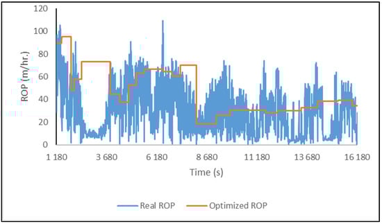 The optimized ROP is greater than the actual ROP in several periods (Figure 8). Results indicate that the implementation of the optimized WOB and RPM values (values obtained using the DE algorithm) provide an average ROP improvement of 56% (average real ROP = 29/Opt ROP = 56).