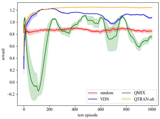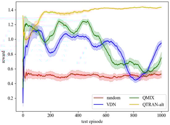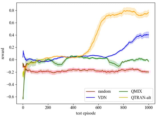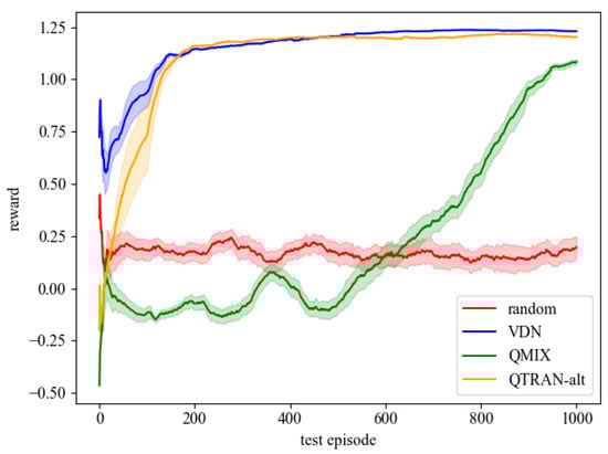 - Sunehag, P.; Lever, G.; Gruslys, A.; Czarnecki, W.M.; Zambaldi, V.; Jaderberg, M.; Lanctot, M.; Sonnerat, N.; Leibo, J.Z.; Tuyls, K.; et al. Value-Decomposition Networks for Cooperative Multi-Agent Learning. arXiv 2017, arXiv:1706.05296. [Google Scholar]