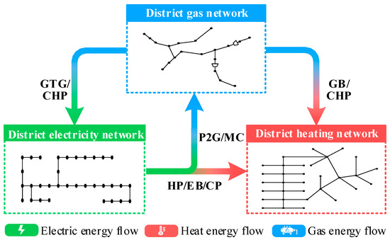 As depicted in Figure 1, the DEN, DHN, and DGN constitute the energy transmission network of IEHGES. All typical energy-conversion devices that interconnect subnetworks are considered, including combined-heat-and-power (CHP) units, gas turbine generators (GTGs), heat pumps (HPs), electric boilers (EBs), gas boilers (GBs) and power-to-gas (P2G) units. The proposed matrix-based modeling method is described as follows.
