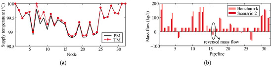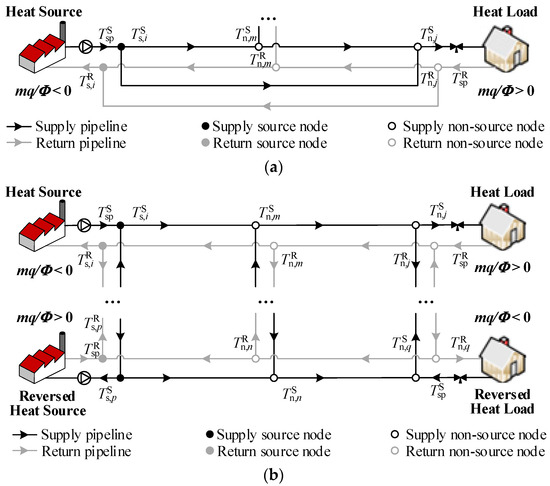 - Current DHN models are unidirectional, with the supply mass flow direction fixed from source to load (opposite in the return network). Nevertheless, as illustrated in Figure 2b, mass flow reversal of pipelines, sources, or loads, i.e., the so-called RMF problem, is commonplace during the EFC process [16,23,36], leading to violation of energy conservation law and even no convergence in existing thermal models.
