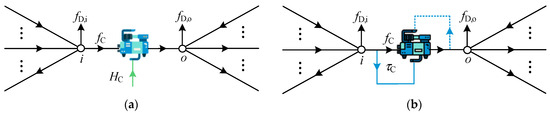where the following applies: TS′ represents the outflow temperature vector of supply nodes; the single subscript ‘n’ indicates that the matrix consists of rows corresponding to non-source nodes; and the double subscript ‘nn’ signifies that the matrix comprises rows and columns corresponding to non-source nodes. The subscript ‘s’/‘ss’ in this part can be explained similarly. Additionally, considering that the mass flow of the supply source node, e.g., node i/p in Figure 2b, may leave into or be injected from both pipelines and sources, Equation (11) for supply source nodes is expressed as follows: