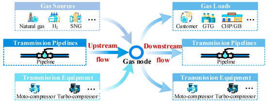 The general relationship between the inflow and outflow of gas nodes is illustrated in Figure 4. The upstream flow with significant composition differences can originate from various gas sources, pipelines, or transmission equipment. Meanwhile, the downstream flow with uniform gas concentration may be injected into gas customers, gas-driven coupling devices, pipelines, or transmission equipment. It has been revealed that models containing loop equations cannot universally describe gas energy flow when variable compressor modes are considered [40,41]. Additionally, conventional gas NPMs also fail to depict the generalized compressor connection structure [42]. Therefore, an expanded NPM originated from [43] is utilized and modified as the cornerstone of the proposed DGN model.