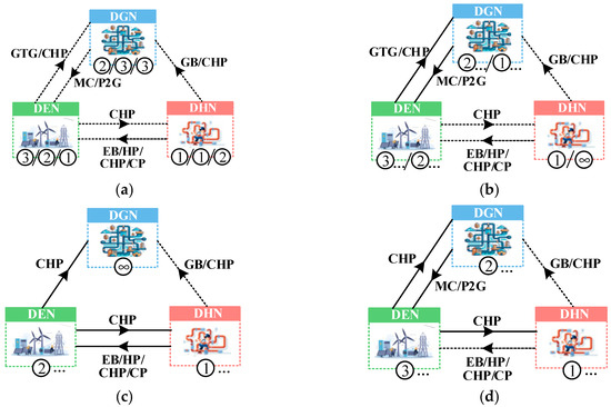 The EFC solution approaches of IEHGES can be categorized as either integrated or disaggregated. The specific implementation of either approach relies on determining the coupling mode, but most of the current EFC methods were dedicated to certain preconfigured coupling modes, which lack portability. To address this issue, four typical coupling modes were classified in [4] for an interaction analysis of IEHGES. Based on the operation modes of electricity–heat-coupling devices, the calculation sequence of the decomposed approach was classified into three types [35]. In [19], six coupling modes of the integrated electricity–heat system were sorted out through permutation and combination. All the existing determination algorithms were designed from the perspective of distinguishing specific devices. Given the vast number of possible combinations of coupling devices, those algorithms are evidently insufficient, resulting in the shallow revelation of the interdependency mechanism of IEHGES.