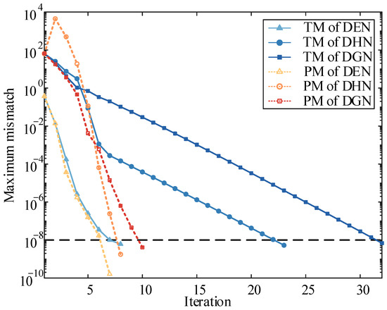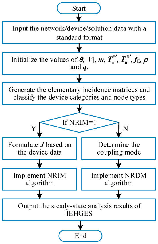The IEHGES consists of coupling devices and energy subnetworks. The energy hub (EH) concept was introduced to describe the collection of coupling devices [6], where the interactions between energy subnetworks were abstracted to a universal coupling matrix. To pragmatize this concept, several versions of standardized modeling methods have been proposed in [7,8], with which the energy flow of EH can be compactly automated into a matrix. However, the above studies only focused on EH itself, the detailed state of another important component of IEHGES—energy subnetworks—was ignored. Typically, the district electricity network (DEN), district heat network (DHN), and district gas network (DGN) constitute the subnetworks of IEHGES. Compared to others, studies on DEN models have been quite in-depth. As the mainstream model, the alternating current (AC) model portrays the operation state of the DEN with a set of nonlinear algebraic equations (AEs). The AC model is streamlined into a universal matrix form by introducing the nodal admittance matrix. To solve this model, the holomorphic embedded (HE) method [9], Gauss–Seidel method, fast decoupled load-flow method [10], etc. were developed, among which the Newton–Raphson (NR) algorithm [11] and its variants have been widely adopted due to their robustness and quadratic convergence. In [12], the matrix-based concise formula of an NR iterative matrix was directly derived from the streamlined AC model to avoid the traditional cumbersome expression form, realizing the standardized modeling and solution of the DEN model. The same EFC framework has been employed in commercial software such as MATPOWER [13], demonstrating its practicality for engineering applications.