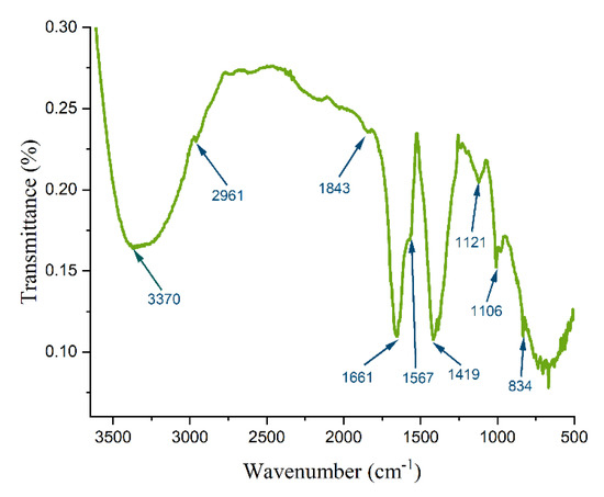 The FTIR spectrum of DEAC, covering the range of 400 to 4000 cm−1, is presented in Figure 2. As reported in previous studies [23,24,25], the broad absorption band observed at 3370 cm−1 can be assigned to the stretching vibrations of hydroxyl (-OH) groups and adsorbed water molecules. A peak at 2961 cm−1 is associated with the stretching vibrations of C-H bonds within the CH2 groups of aliphatic chains. Additionally, the spectrum reveals out-of-plane bending vibrations of C-H bonds in aromatic structures at 834 cm−1, alongside a weak signal at 1843 cm−1, which is attributed to C-H bending in aromatic systems. Notably, a strong peak at 1661 cm−1 is characteristic of benzenoid rings, while the peak at 1567 cm−1 corresponds to the stretching vibrations of aromatic C=C bonds. Within the spectral region of 1550–1800 cm−1, prominent peaks typically indicate the presence of carbonyl (C=O) functional groups, which are commonly found in ketones, aldehydes, esters, and carboxylic acids. However, in this case, the overlapping signals from aromatic functionalities make it challenging to distinctly identify the C=O bonds. A peak at 1419 cm−1 is indicative of phenolic groups in the sample. Furthermore, the band observed at 1006 cm−1 may arise from C–O stretching vibrations, although this region can also include contributions from P=O and P=O-OH groups. These phosphorus-containing groups are likely retained in the sample structure due to the use of phosphoric acid during the activation process. In conclusion, the FTIR spectrum demonstrates a remarkable diversity of functional groups within the DEAC sample. This outcome is likely influenced by a combination of factors, including the unique chemical structure of the starting bio precursor, the chemical activation method employed, and the specific carbonization strategy applied during synthesis.