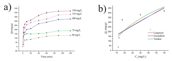 AMB sorption kinetics onto DEAC is presented in Figure 6a. In the initial few minutes of contact, the sorption capacity increased significantly, rising steadily for an hour and a half before reaching final equilibrium after 120 min. During the course of sorption, gradual binding of the sorbate to the unoccupied sites on the sorbent surface prevails. The sorption process reached steady phase when there was a slight change in sorption capacity as the system came closer to equilibrium. It is noticeable from Figure 6a that during contacting, sorption capacity in the case of Ci = 50 mg/L increased from 28.8 mg/g after a couple of minutes to a final value of 133.8 mg/g, corresponding to equilibrium. In the case of Ci = 150 mg/L, a similar rise was noticed from 225.2 up to 420.2 mg/g as the maximum equilibrium value.