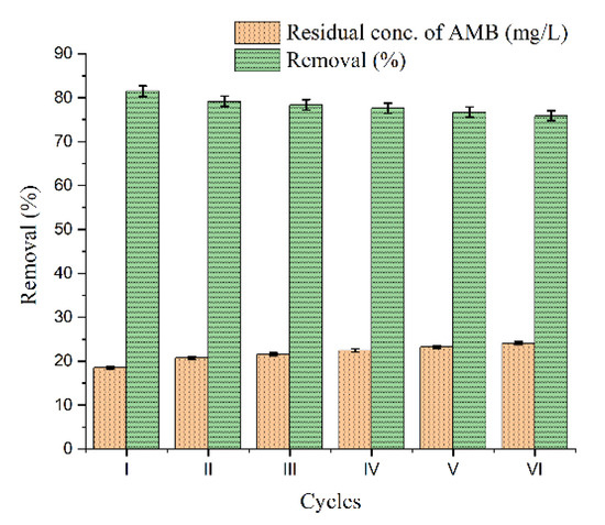 AMB sorption/desorption tests onto DEAC were run through six cycles in a row and the outcome is shown in Figure 7. The AMB removal efficiency, which was 81.47% at the conclusion of the first cycle, dropped to 75.89% by the end of the sixth cycle. The irreversible saturation of active sorption sites or even slight structural changes influenced by sorbent washing are likely the motive of this slow progression. Even after six cycles, this carbon-based sorbent was still very effective and quite stable, as seen by the decrease of less than 1.2% in the removal extent between the fifth and sixth cycle.