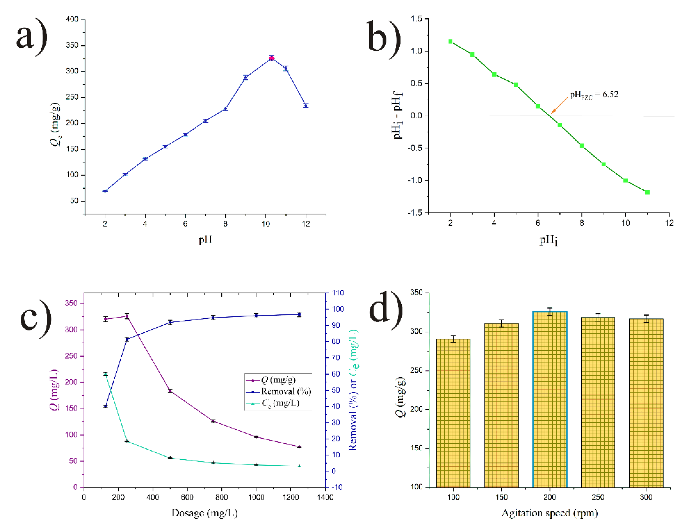 (a) Effects of pH, (b) pHPZC of DEAC, (c) effect of dosage, (d) effect of stirring speed.