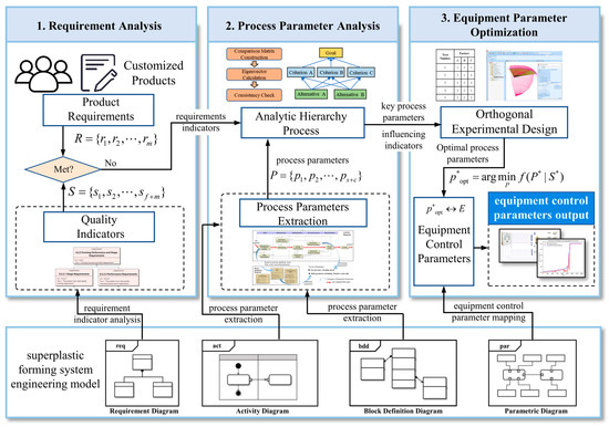 Based on the problem analysis in Section 2.1, this paper proposes a process parameter optimization method that integrates SPF manufacturing process information with customized product requirements within an MBSE environment. The method tracks the influence of requirements on both process parameters and equipment control parameters to minimize conflicts and redundancies in their design. The basic procedure is illustrated in Figure 2 and includes the following steps: