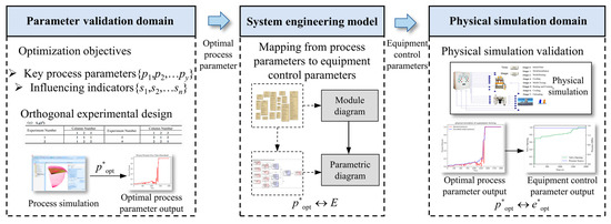 After extracting and analyzing the process parameters, the key parameters P* = {p1, p2, … py} and the influencing indicators S* = {s1, s2, … sn} for SPF requirement indicators can be obtained. To further achieve the optimal combination of process parameters and guide the optimization of equipment control parameters, a method combining orthogonal experiments and simulation techniques for equipment control parameter optimization is proposed within the MBSE environment. The optimization process is shown in Figure 5, where process parameters and equipment control parameters are jointly optimized through simulation software.