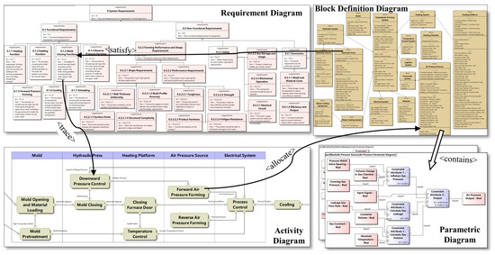 The MBSE model for the 800T SPF, as shown in Figure 6, is built upon the SysML framework illustrated in Figure 3. This model not only demonstrates the interrelations among the internal elements but constructs the relationships between modeling elements across different diagrams. For example, the <satisfy> relationship between the hydraulic press and the mold closing function, the <trace> relationship between the mold closing function and the downforce control, and the <allocate> relationship between the air pressure forming and the air pressure source. The parametric diagrams shown include the air pressure parametric diagram, temperature parametric diagram, and others.