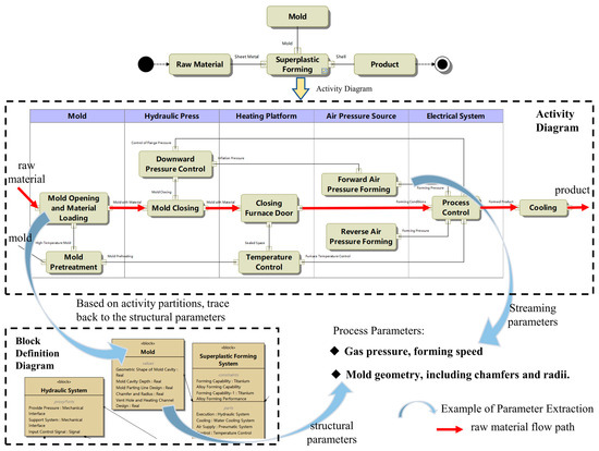 The ACT visually presents the process of the SPF equipment during production, as well as the involvement of equipment modules. A method is proposed for organizing and classifying process parameters through the ACT, as shown in the flowchart methodology in Figure 4. By focusing on the ACT, the flow path from raw material to finished product is observed from a global perspective. The raw material flow path is considered the main path, and all module parameters involved in the activities along this main path are classified as process parameters. Additionally, all object flows that enter the main path, along with their streaming parameter, are also treated as process parameters affecting the forming process. This paper designs a process parameter extraction flow based on this logic using the ACT.