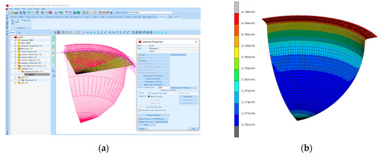 MSC Marc superplastic forming simulation: (a) initial simulation state and interface; (b) simulation result state.