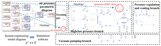 In the MBSE method, the SysML parametric diagram is an extension of the module diagram, which intuitively expresses and analyzes the equipment control parameters involved in the process parameters and their constraint relationships. In this study, the equipment control parameters related to the optimal process parameter combination are located in PAR, capturing one or more design constraints. Based on these constraint relationships, the corresponding equipment control parameters E* = {e1, e2, … em} are determined, realizing the mapping of process parameters to the equipment control parameters. On the basis of this parameter mapping, physical simulation is used to verify and optimize the relevant equipment control parameters, ultimately generating the equipment control parameters e*opt = {E*|p*opt satisfies the optimal process parameter combination} that meet the output requirements of the optimal process parameter combination.