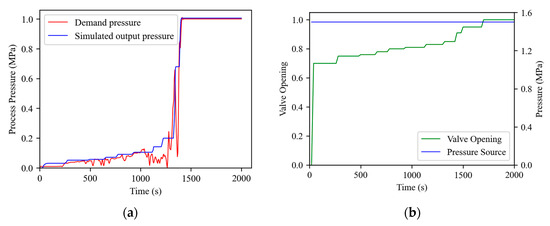 Physical simulation results of superplastic forming: (a) demand pressure output curve and simulation output pressure curve; (b) equipment control parameters of the pressure relief valve and air pressure source.