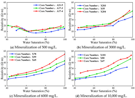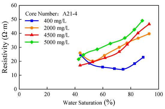 As shown in Figure 3, the relationship curve of resistivity affected by injection water with different mineralization levels is presented. Taking the A21-4 core as an example, as the salinity of the injected water increased from freshwater to wastewater, the resistivity–saturation curve exhibited a clear salinity dependence: when low-salinity wastewater was injected, the curve showed a concave shape; as the salinity of the injected water increased, the curve no longer showed a concave feature, but instead presented a steady upward trend with increasing water saturation. As the water saturation increased, the resistivity increased more, and the final resistivity at the residual oil saturation was also higher. This means that, in the case of high-mineralization waterflooding, after the injection water floods the reservoir, the electrical response characteristics of the flooded layer will change significantly as the flooding degree deepens, specifically showing a gradual increase in resistivity and thus presenting a high-resistivity phenomenon. The formation resistivity is not only closely related to the mineralization of the injection water, but is also significantly affected by the water saturation. Therefore, in actual reservoirs, the waterflooding condition can be determined based on the electrical response characteristics, and the flooded layers can be interpreted, leading to effective adjustment measures.