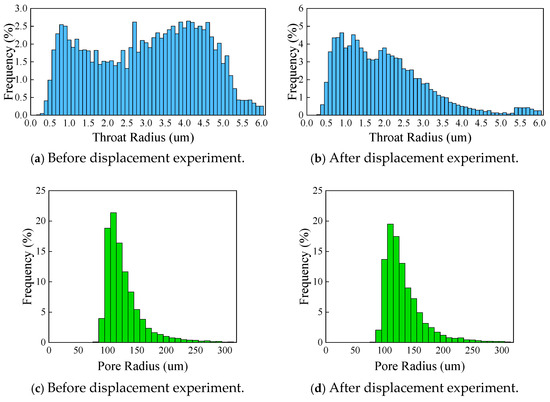 The study of the A21-4 core revealed changes in the throat radius distribution frequency before and after the displacement experiment, as shown in Figure 4. The displacement experiment with a salinity of 5000 mg/L was taken as an example for the analysis, as high-salinity fluids have a more pronounced effect on pore-throat structures and thus more clearly reflect the patterns of physical property changes under reservoir conditions. Prior to the experiment, the throat radius distribution of the core samples exhibited a uniform characteristic, with most of the radii falling in the range of 0.5–5.5 µm, accounting for 94.37%. After the experiment, the throat radius distribution shifted significantly, with a marked increase in the number of throats in the 0.5–2.5 µm range, and with the average frequency rising by 1.894%. Meanwhile, the number of throats in the 2.5–5.5 µm range decreased significantly, with the average frequency dropping by 2.073%. Notably, the change in the pore radius distribution frequency was small, with relative changes of less than 5%. This result indicates that the wastewater displacement process mainly affected the throat structure of the core sample, causing a shift from medium-scale throats (2.5–5.5 µm) to small-scale throats (0.5–2.5 µm).