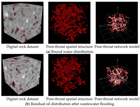 To characterize the changes in the throat and pore radius distribution in the core samples mentioned above, a data volume of 100 × 100 × 100 μm was extracted from the core samples before and after the displacement experiment. By comparing the pore network models before and after the displacement experiment, the connectivity of the throats, the evolution of the pore space, and the trend in the changes in throats of different scales could be visually observed. This further revealed the impact of wastewater displacement on the microstructure of the reservoir. To display the 3D view of the pore network model, spheres and cylinders were used to represent pores and throats, respectively, as shown in Figure 5. The pore-throat distribution was densest in the bound water state of the core, indicating the good connectivity of the pore network. After the wastewater displacement experiment, the pore-throat distribution significantly decreased, with a particularly notable reduction in the number of larger throats. Therefore, in subsequent protective studies, attention should be focused on the structural changes of the throats and protection measures.