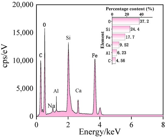 A suitable amount of each freshwater filter membrane sample was placed on a glass slide, dried, and then subjected to calcination before undergoing an energy spectrum analysis. The analysis results are shown in Figure 6. The main impurities in the wastewater were O, Si, and Fe, with their contents being 37.2%, 24.4%, and 17.7%, respectively. In addition, the Ca content was 9.52%, and Al and C each accounted for approximately 5%.