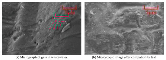Experiments were conducted to evaluate the compatibility of wastewater with freshwater and the compatibility with core samples, using electron microscope scanning images for micro verification. After removing the oil film floating on the wastewater surface, a centrifuge was used to stir the wastewater, and a glass column was employed to collect the polymer from the wastewater. The results are shown in Figure 7a. Figure 7b shows the microscopic image after the wastewater and freshwater compatibility experiment. It was clearly observed that organic substances in the wastewater underwent significant aggregation or crystallization under the effect of freshwater, forming flaky, blocky, or flocculent suspended particles. The particle size of these suspended particles was generally ≥10 µm. The scattered aggregation was mainly due to the presence of oil-based contaminants in the wastewater, typically composed of various organic and inorganic components, including asphaltenes, waxes, resins, clay minerals, and chemical additives, which are incompatible with freshwater.