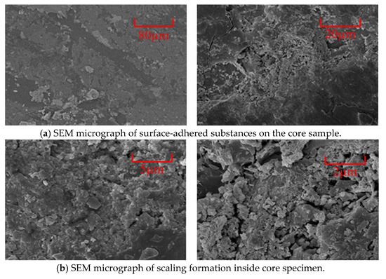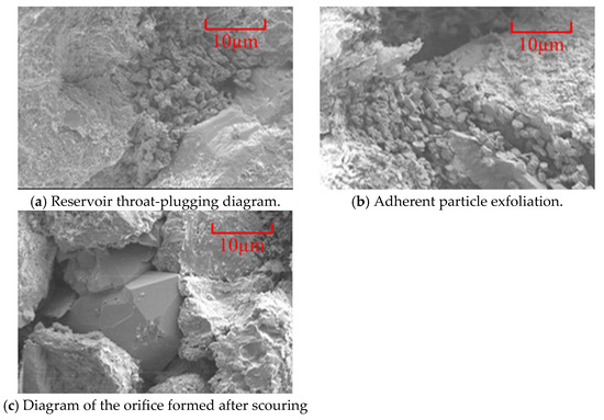 In the wastewater reinjection operations of the Xinli Oilfield, the reservoir is highly susceptible to contamination, posing a challenge for efficient oilfield development. Based on previous research, the various impurities and clay minerals in the wastewater negatively affect the pore-throat structure of the reservoir during the reinjection process. This study used SEM scanning electron microscopy to analyze the pore-throat structure from a microscopic perspective. As shown in Figure 10a, the pore throats were completely blocked by adhesive clay particles. The wastewater contained complex chemical components and metal ions such as calcium () and magnesium () ions, which, during the reinjection process, can react with carbonate () and sulfate () ions to form precipitates. The chemical reaction formula is as follows: