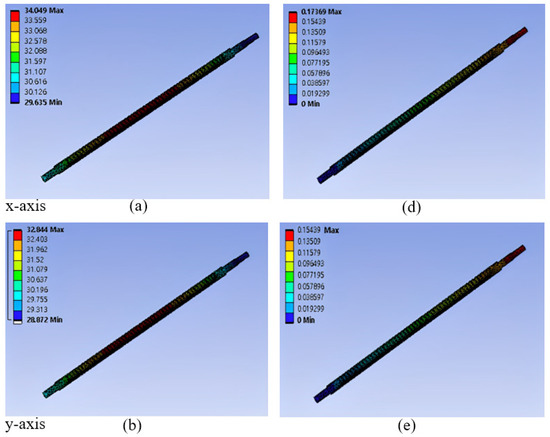 The simulation results for the NSK ball screw are presented in Figure 8. For the X-axis ball screw (1127 mm), the maximum temperature was recorded 34.05 °C with the axial displacement of 174 µm while for the Y-axis ball screw (1022 mm), the temperature was recorded 32.8 °C and the axial displacement of 154 µm. Similarly for the Z-axis ball screw (932 mm), the temperature was noted 31.8 °C and the axial displacement of 142 µm.