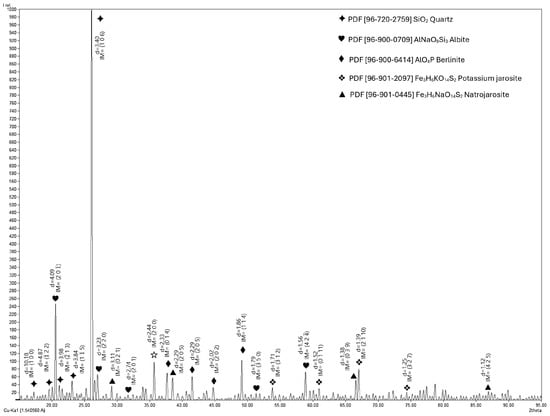 Furthermore, the X-ray diffraction analysis revealed the primary mineral phases comprising the material, including quartz, albite, berlinite, potassium jarosite, and natrojarosite, as shown in Figure 1.