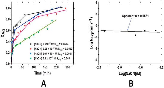 On the other hand, Figure 2B shows, in a logarithmic form, the treatment of the data obtained from Figure 2A. Clearly, an apparent reaction order of n = 0.0531 can be seen for the range of concentrations studied. This confirms that has virtually no effect on the overall rate of the cyaniding process. This suggests that the reaction is controlled by factors such as the contact surface between and Ag, temperature, or the presence of reactants (maybe NaOH) [11,12]. Therefore, silver cyaniding is a zero-order reaction, meaning that the reaction rate does not depend on the cyanide concentration. Thus, the reaction may be controlled through cyanide’s diffusion to the silver surface rather than the cyanide concentration itself to this effect.