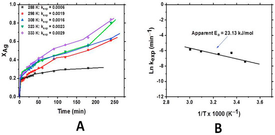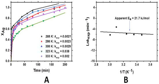 The effect of temperature on the leaching process was studied by varying the temperature (288, 298, 308, 323, and 33 K) while keeping the other parameters constant: [NaCN] at 2.4 × 10−2 M, [NaOH] at 1 × 10−2 M, a stirring speed of 750 rpm, a solution volume of 500 mL, a sample weight of 40 g/L, and a total reaction time of 240 min. Figure 3A shows the values of the cyanided silver fraction as a function of time for each temperature tested. From the observed data, the corresponding kexp values were determined and are shown.