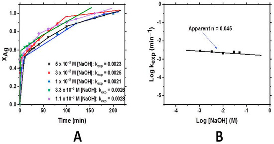 Kinetic study of silver cyaniding; [NaOH] concentration effect: (A) kexp and (B) reaction order, n = 0.045.