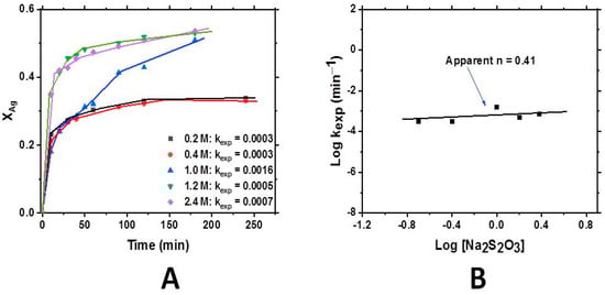 In Figure 5B, dependence of log kexp on log [] is observed. It can be seen that in a range of thiosulfate concentrations from 0.2 to 2.4 M, a reaction order of n = 0.41 is established. The reaction order obtained can be attributed to the fact that at low thiosulfate concentrations, the leaching rate of silver is primarily governed by the complexing reagent itself. Nevertheless, as is evident from the figure, beyond a thiosulfate concentration of 1 M, the leaching rate increases with respect to further increases in the reactant concentration and is influenced by the oxygen levels in the system. In contrast, in other studies [28] where thiosulfate was used during the leaching of a SEDEX-type ore, a reaction order of 5.03 was established for silver leaching, indicative of a strong dependence of the reaction rate on the reagent concentration. In this case, the effect of thiosulfate is small due to the silver being in metallic form, which promotes its rate of leaching.