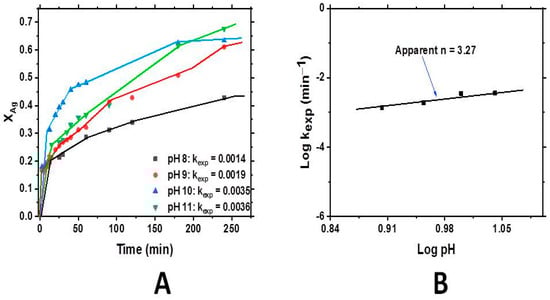 The effect of pH on the leaching process was studied by varying the pH (8, 9, 10, and 11) while maintaining the other variables constant: a temperature of 298 K, [] at 0.25 M, a stirring speed of 750 rpm, a solution volume of 500 mL, a sample weight of 40 g/L, and a total reaction time of 240 min. Figure 7A shows the fraction of leached silver versus the reaction time. Increasing slopes and kexp values can be observed, indicating a significant effect of pH on the overall reaction process (n = 3.27), with a marked reaction rate at a pH of 10.