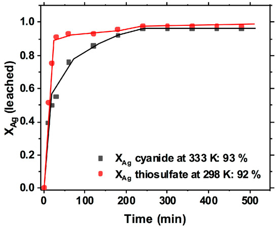 Finally, the optimal conditions for both cyaniding and silver leaching using thiosulfate systems were determined. Under these conditions, a maximum silver recovery of 92% was achieved through cyaniding at 323 K, and 93% leached silver was obtained when using thiosulfate at 298 K (Figure 8). Similar results have been reported in the treatment of Ag2S, where a recovery of 90.5% was achieved [21]. However, despite both systems yielding comparable silver recovery rates, the use of cyanide is less desirable due to its toxicity and hazardous nature, as well as the higher working temperature required.
