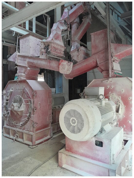 Hammer mills are fundamental in the feed industry because of their critical role in particle size reduction. This process not only ensures uniform particle size, but also improves the digestibility of nutrients in animal diets and optimizes the subsequent stages of mixing and compaction [14,15,16]. However, the energy efficiency of this equipment is highly variable and is influenced by factors such as material density (ranging from 0.5 to 0.8 , rotor speed (1500 to 3000 rpm), screen design (2 to 6 mm openings) and material moisture (5% to 15%) [17,18,19,20]. It has been reported that hammer wear, when not properly managed, can increase energy consumption by 25%, resulting in an increase of up to 5 kWh/t processed [21,22,23].
