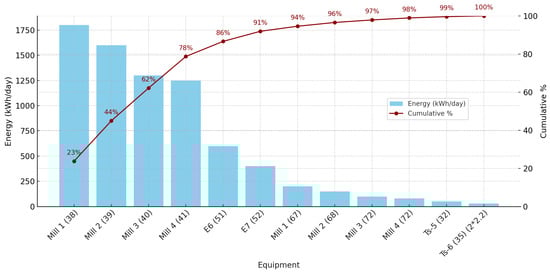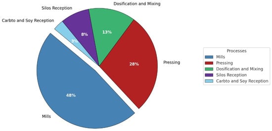 The growing global demand for animal feed for the agricultural sector, projected to reach a market value of more than USD 500 billion by 2030, has intensified production in feed mills, which poses significant challenges in terms of energy consumption and environmental sustainability [1,2]. These facilities face structural deficiencies in the efficient use of energy, with consumptions ranging from 15 to 50 kWh/t processed, depending on the equipment used, raw material characteristics and operating conditions [3,4]. This high energy consumption represents up to 30% of operating costs in some factories and contributes significantly to greenhouse gas emissions, with impacts estimated at 0.08 to 0.15 t CO2/t processed [5,6].
