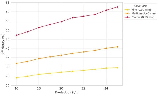 This analysis explores how the flow rate (m) affects the grinding efficiency () for different sieve sizes (1 for 0.30 mm, 2 for 0.40 mm, 3 for 0.59 mm).