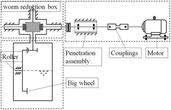Figure 1. The primary devices include a motor for driving, a shaft for connection and transmission, a coupling, and a worm reduction box. The motor drives a large wheel through these components to facilitate the transportation of industrial waste materials.