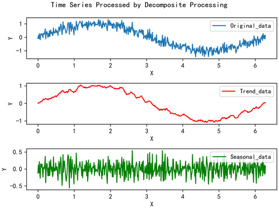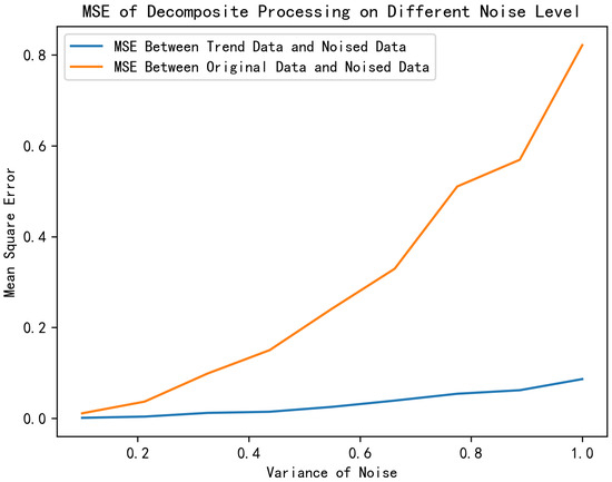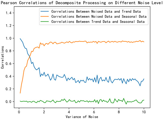 Figure 6. As the noise variance increases, the correlation between the Trend data and the Noised data gradually decreases, indicating that the proportion of the data information captured by the Trend component decreases. Conversely, the correlation coefficient for Seasonal Data increases, suggesting that the Seasonal component retains a growing share of the information. Furthermore, the correlation coefficients between Seasonal and Trend remain consistently low, demonstrating that the two components are approximately orthogonal. These observations illustrate that the time series decomposition method effectively separates the data into two uncorrelated components while minimizing information loss.