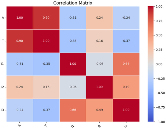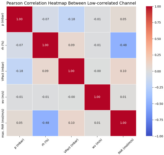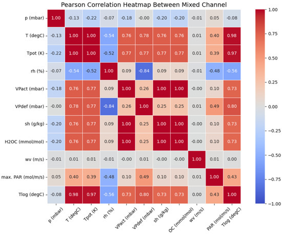 Figure 8 is presented as a heat map to visualize the Pearson correlation coefficients between channels, demonstrating their coupling characteristics. The colors in the figure represent Pearson’s correlations between different variables within the range of −1 to +1: lighter shades near zero indicate no significant relationship between variables, while darker shades approaching 1 signify strong correlations. Darker red hues indicate stronger positive correlations between variables, whereas darker blue hues denote stronger negative correlations. The symbols on the X and Y axes correspond to different channel names. This heat map visually demonstrates the interaction relationships among the channel data in the dataset used.