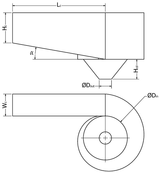 In the design of the cone, two key parameters were considered: the total height of the cone and the outlet diameter. These parameters, along with the height, width, and inclination of the channel, were optimized through RSM. This approach helped establish a variation range and identify the optimal values for these geometric parameters, ensuring that the discharge cone and inlet channel design maximized circulation and overall system performance. Figure 2 illustrates the selected geometric parameters for the study, where α is the inclined angle of the channel, D o u t is the outlet hole diameter, W c is the inlet channel width, H c is the inlet channel height, and D i n is the inlet diameter.